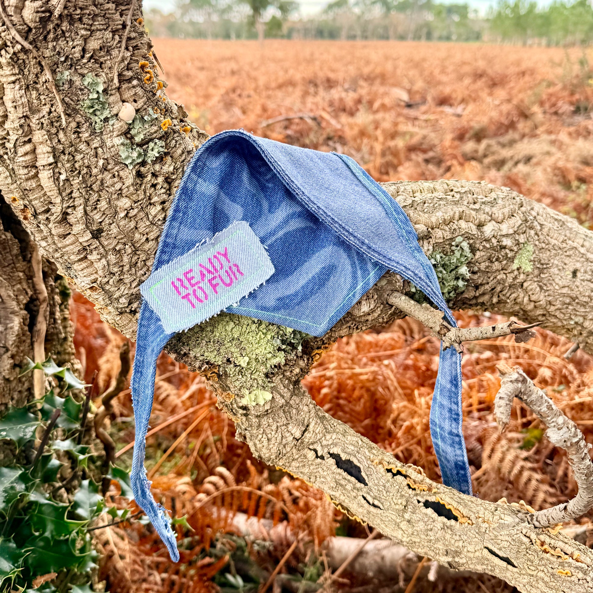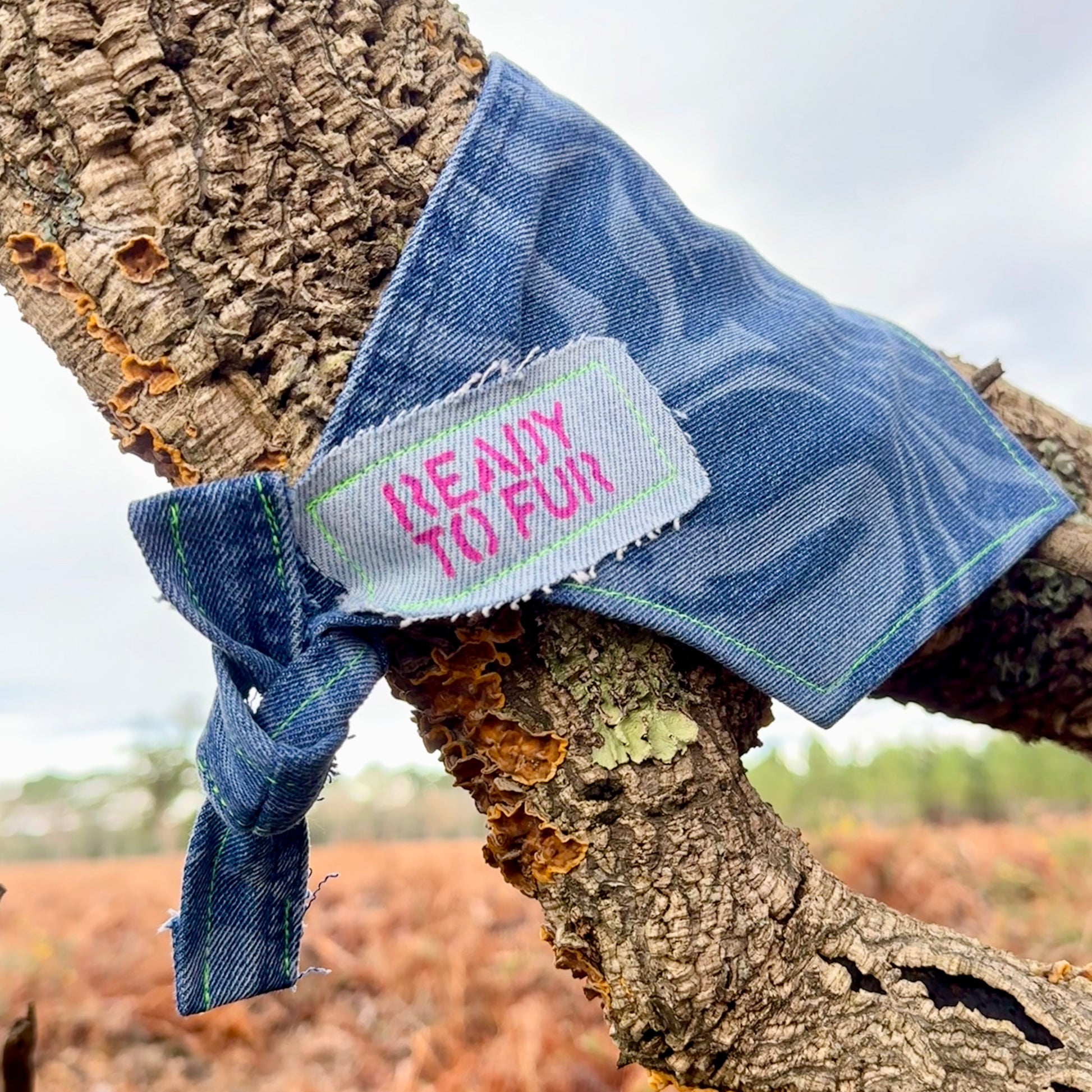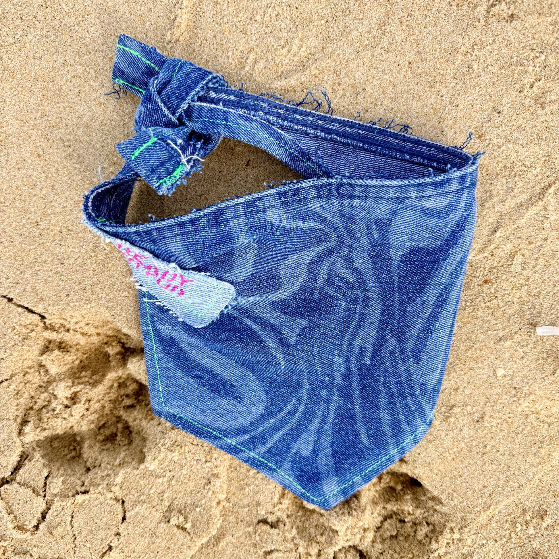 Upcycled jeans turned pet accessory! Add a pop of color to your pup's wardrobe with this printed dog bandana, lined with frayed edges and colorful stitching designed to stand out. Catering to dogs in all shapes and forms due to generous strap length for a comfy double knot — sizes ranging from S up to XL.