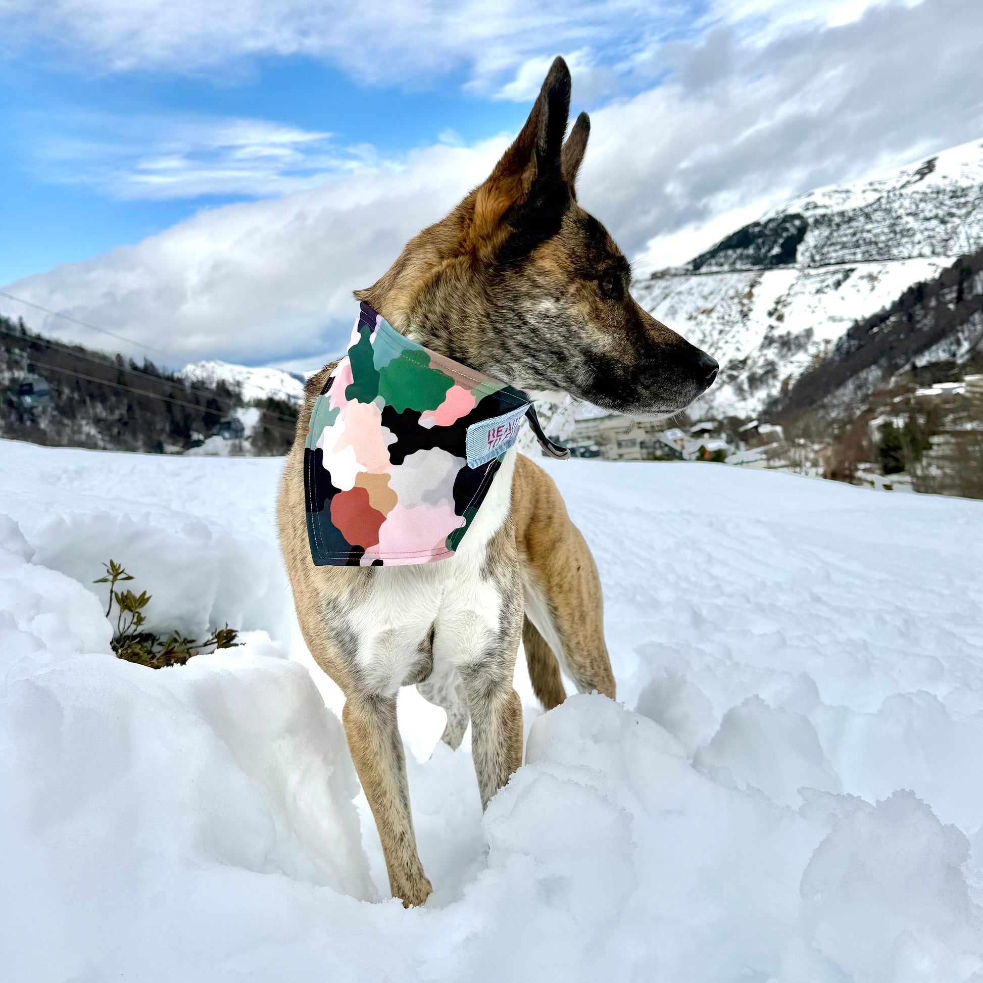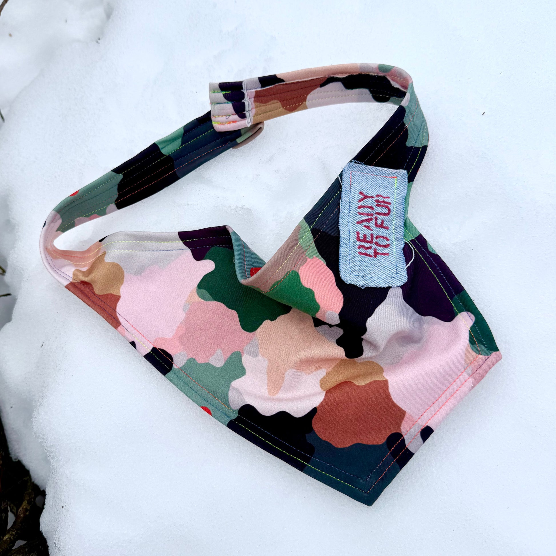 Trendy, upcycled bandana reworked from a vintage hoodie in a colorful camo pattern. Perfect for playful pups who like to go on adventures out in nature! Soft, durable material with elastic straps. Handmade and one-of-a-kind design with our signature denim label.