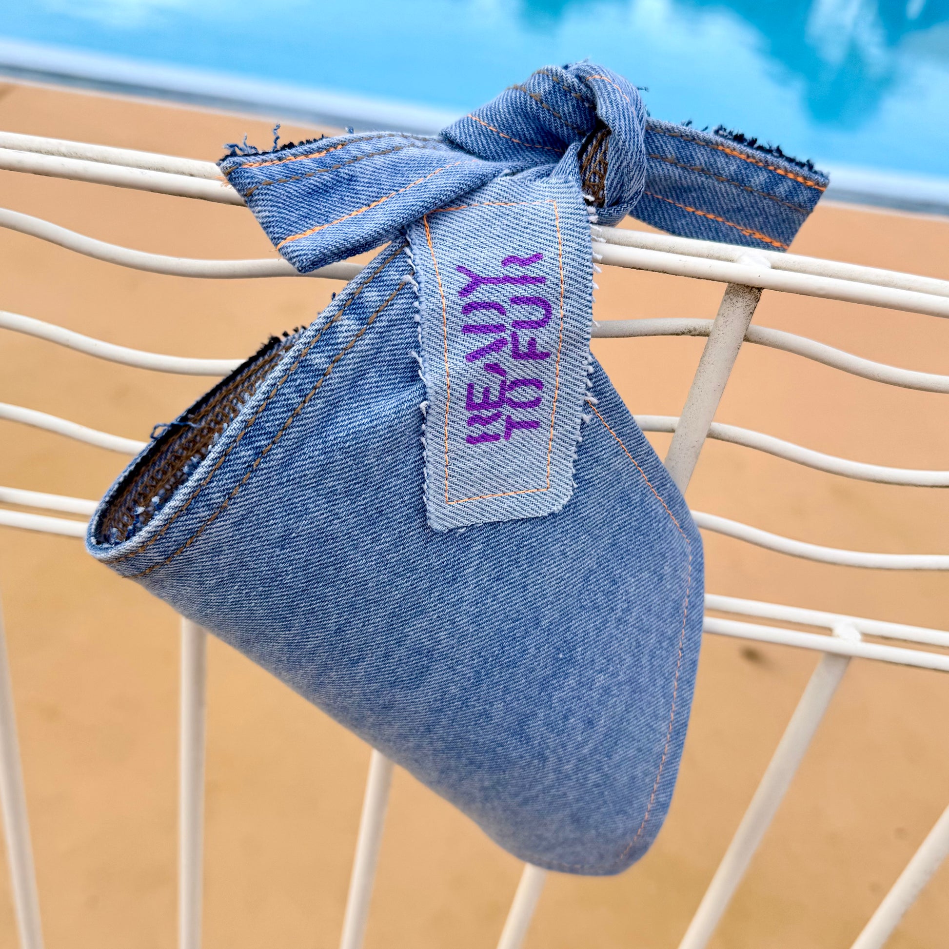 Upcycled jeans turned dog bandana. Timeless denim fabric with frayed edges, lined with colorful stitches designed to stand out. Catering to dogs in all shapes and forms due to generous strap length for a comfy double knot — sizes ranging from S up to XL.