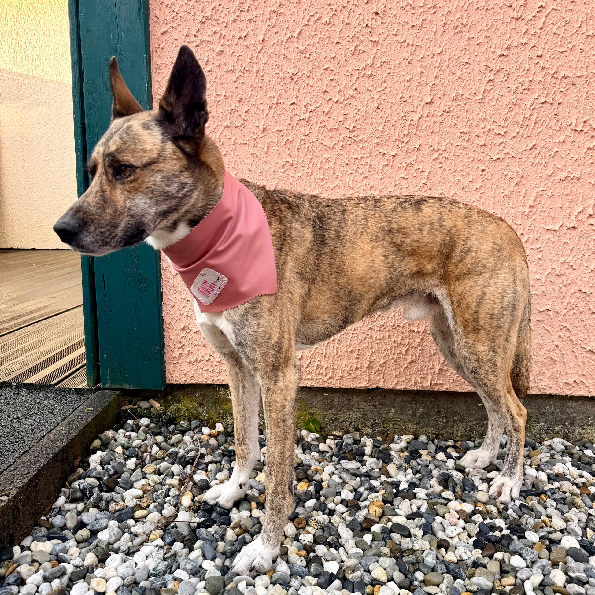 Pink beauty upcycled from coated, faux-leather pants in very good condition. 1 of 1 reworked dog bandana with a hand-sewn label sourced from reclaimed hoodie material. Eye-catching zig zag seams and a soft lining — a must-have for trendy pups.