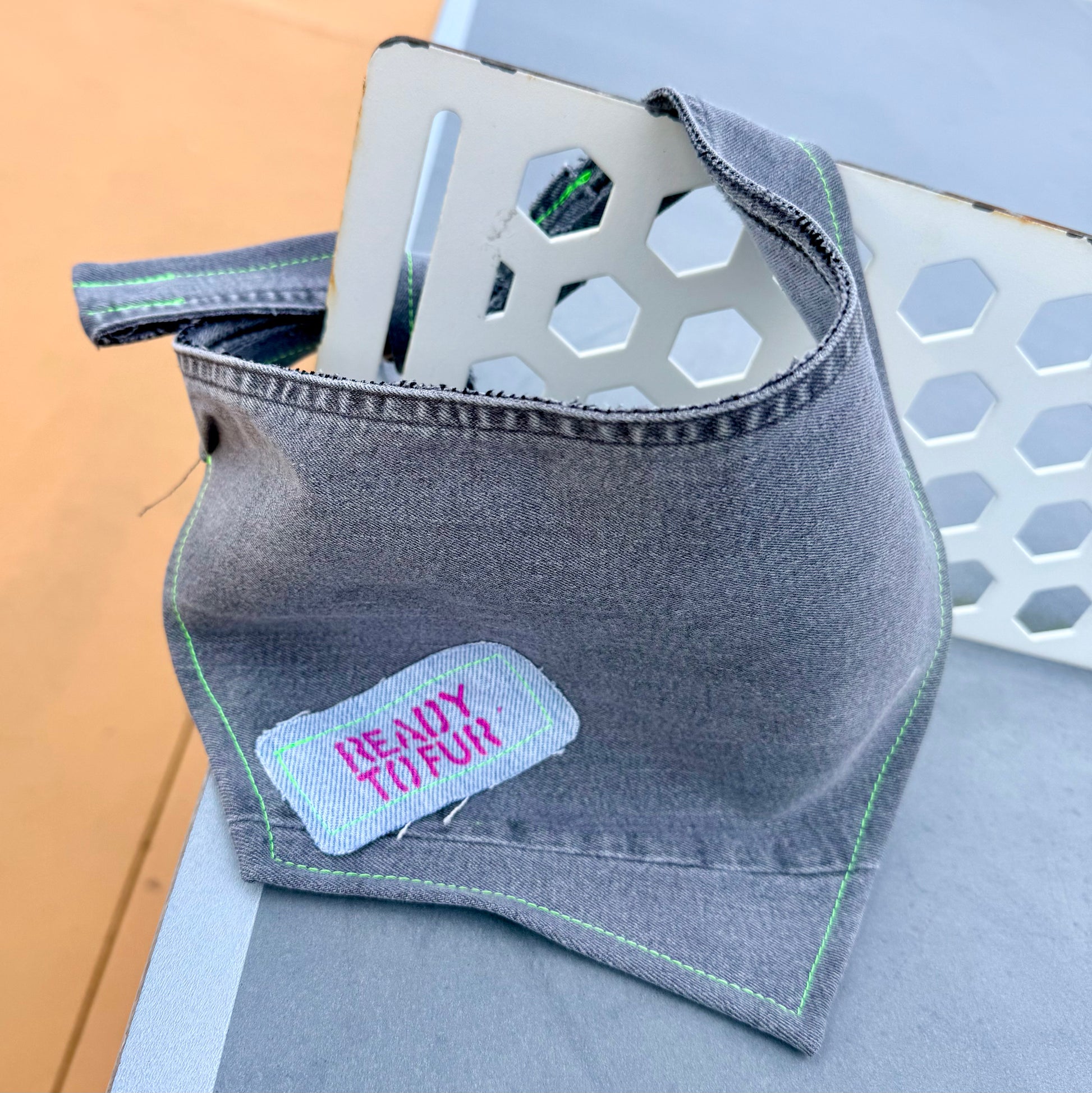 Upcycled jeans turned dog bandana. Timeless denim fabric with frayed edges, lined with colorful stitches designed to stand out. Catering to dogs in all shapes and forms due to generous strap length for a comfy double knot — sizes ranging from S up to XL.