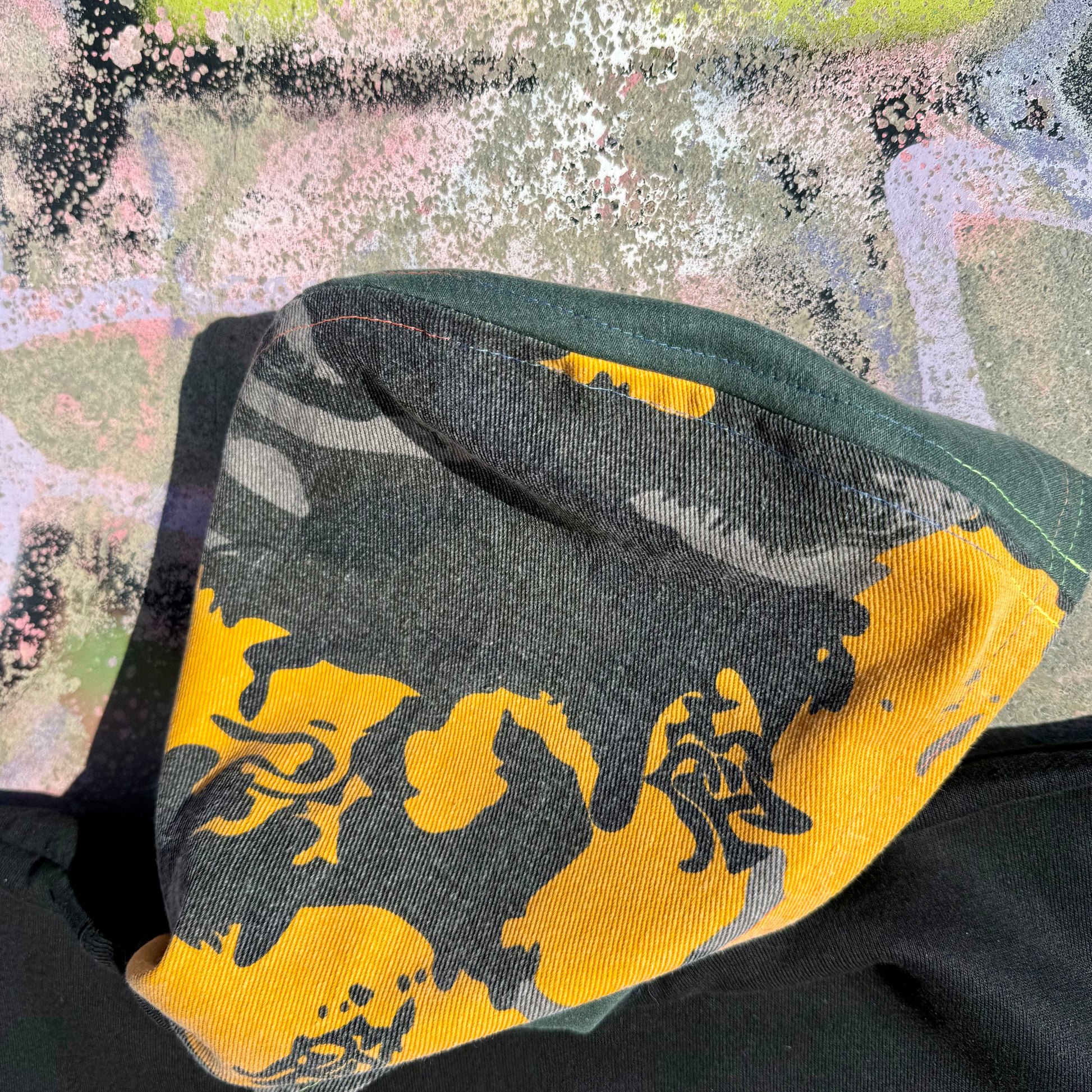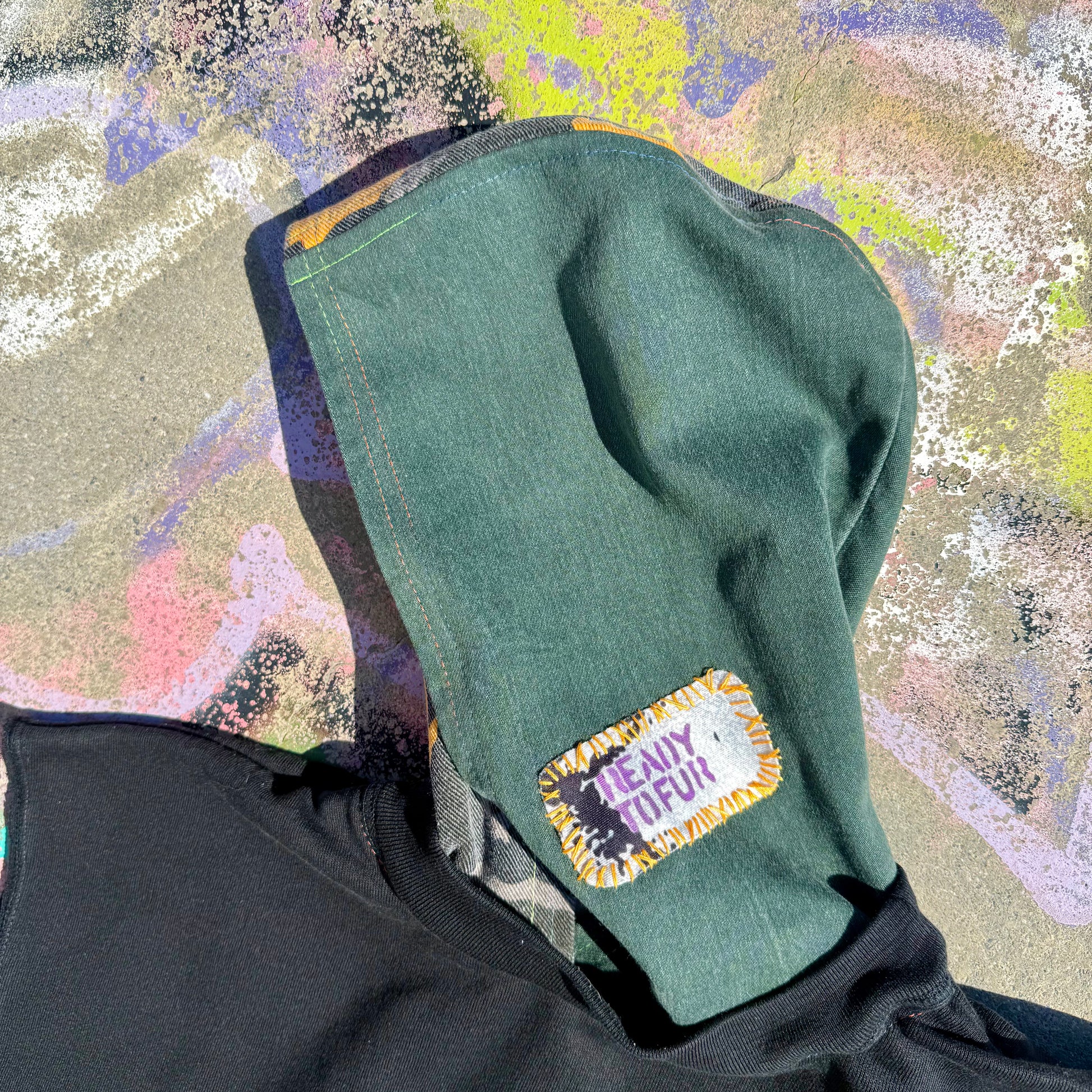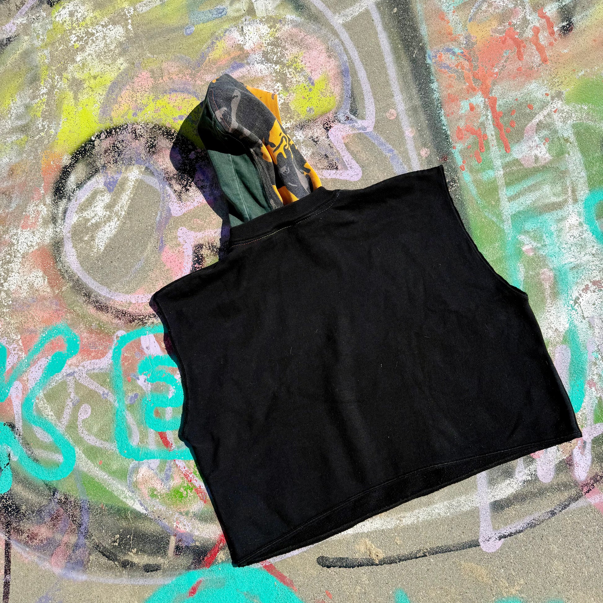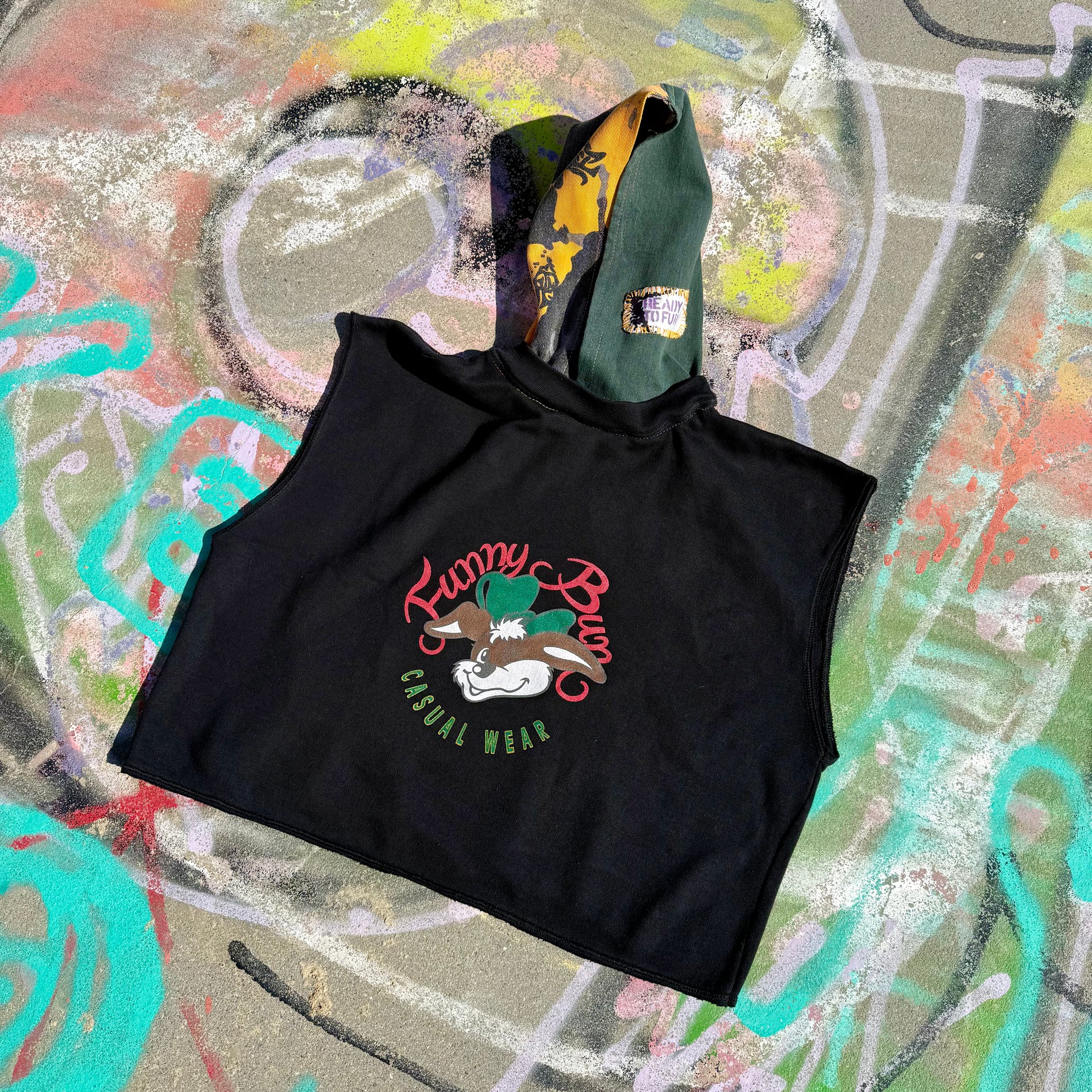 Reworked from upcycled vintage materials. Visible construction details and fraying are part of our raw edge streetwear aesthetic.