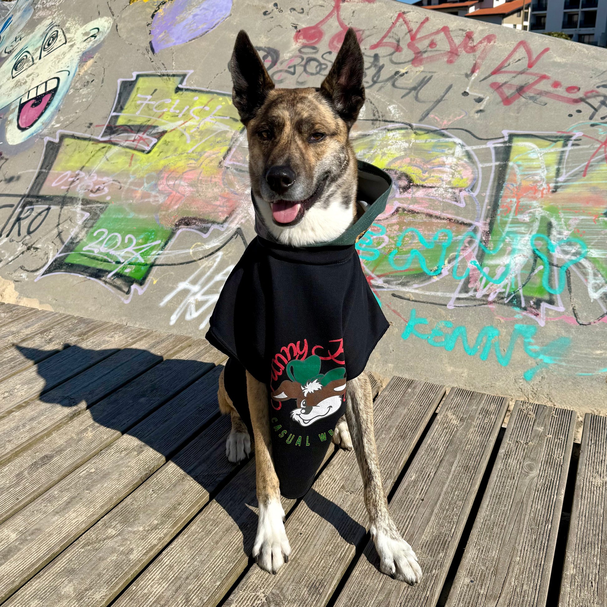 One-of-one oversized streetwear dog hoodie featuring: