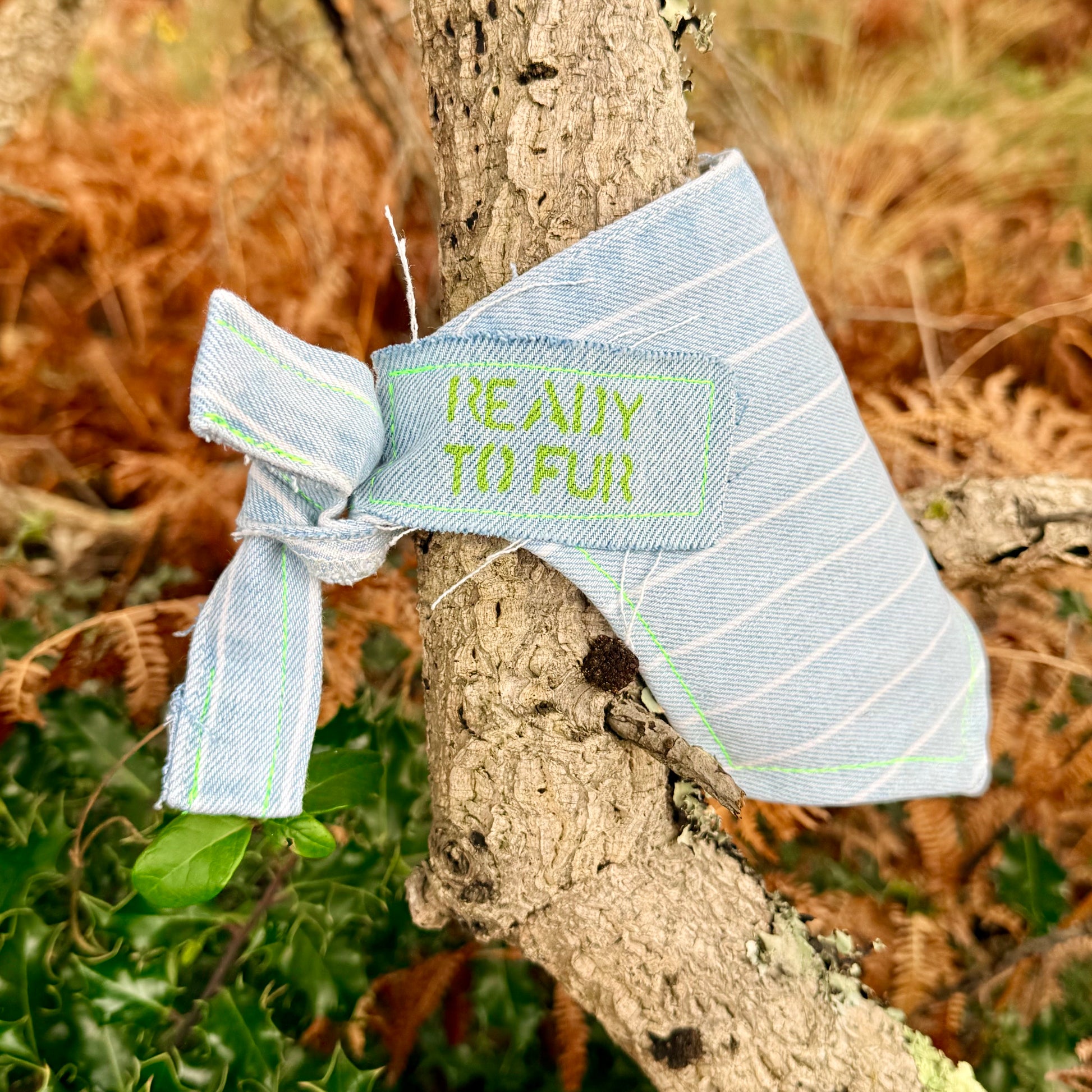 Upcycled jeans turned pet accessory! Add a pop of color to your pup's wardrobe with this printed dog bandana, lined with frayed edges and colorful stitching designed to stand out. Catering to dogs in all shapes and forms due to generous strap length for a comfy double knot — sizes ranging from S up to XL.